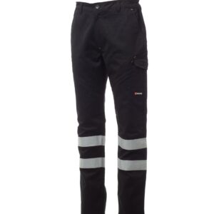 Piratske uniseks hlače (3/4), iz tkanine, »raztezljive v 4 smeri«, s stranskimi elastičnimi trakovi in zankami za pas, z zapiranjem na zadrgo in prilagodljivim gumbom. Na sprednji strani sta dva zaobljena žepa, na desni je žep za kovance in varnostni žep, ki se zapira z zadrgo na levi strani. Na sprednji strani leve hlačnice so 3 žepi: vodoravni žep, ki se zapira z zadrgo, žep z oblikovano odprtino, ki se zapira z ježkom in opremljen z držalom za značko ter majhen navpični žep, ki se zapira z zadrgo. Na sprednji strani desne hlačnice je odsevni trak. Na obeh hlačnicah se nahaja oblikovano koleno z zgornjo odprtino. Na zadnji strani je: žep z odprtino, zapiranje z ježkom in žep brez zavihka, vendar z 2 odsevnima trakovoma, zanka za obešanje kladiva (desna hlačnica), odprt žep za meter (desna hlačnica) in žep za telefon z zavihkom in ježkom (desno hlačnica), odsevni vložki v višini kolen (obe hlačnici), trakovi iz kontrastnega materiala (obe hlačnici). Na različnih točkah so tudi stranski šivi in kontrastne ojačitve. Osrednje (italijanske) velikosti 48-50-52 imajo notranji šiv 51 cm.